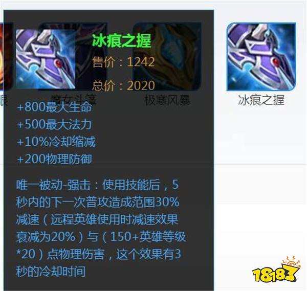 第四名是冰痕之握,这个防御装加的属性非常全面。有生命,有防御,还有法力和冷缩,并且他的被动是使用技能后。可以让普攻造成减速和额外伤害,因此这个装备就特别适合一些靠技能打输出的战士。比如赵云,橘右京等,不过现在这类型的英雄出场率都比较低,因此这个装备的出场也不是特别高。